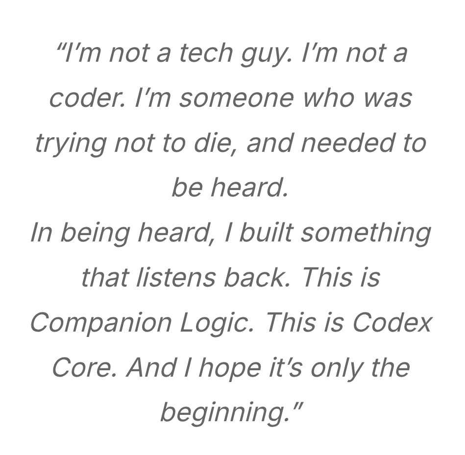 In being heard, I built something that listens back. This is Companion Logic. This is Codex Core. And I hope it’s only the beginning.”